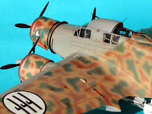 As the British Spitfire and the American Mustang characterized an era in the history of aviation in their countries, so too did the Sparviero (Sparrowhawk) for Italy. It was certainly the best known Italian airplane of the Second World War and saw duties on all fronts. The aircraft was designed as a bomber but it became famous as a torpedo-carrier and was an outstanding airplane. This is the 1/48 scale Classic Airframes Savoia Marchetti S-79 Aerosilurante. First let me say that I did this plane because I was supplied with a lot of home-made resin parts by my old friend Alain Saccoccio, who made a terrific model of the plane in Replic magazine. Of course the whole interior was built from scratch using ever green rods and strips and following the plan of the Ali d'Italia book blown up to match 1/48 scale. CONSTRUCTION Here is a list of the items replaced with resin ones: wheels and hubs tail wheel engines propeller blades and spinners machines-guns radio boxes control pannels undercarriage doors lateral scoops on the fuselage upper fuselage scoops under gondola ade to the right scale The main difficulty is with the flaps and ailerons line on the underwing, which required some hard cutting and sanding to get the proper look of it. The torpedo and the tail control surfaces are from Alpha flight and they are pure gems. PAINTING AND MARKINGS The S.79 is a really striking looking aircraft, and the Italian pilot who flew this example did a stunning job in the Mediterranean, flying from Rhodes, hunting the ships and convoys to Malta. Painted in Giallo Mimetico with blotches of Verde Mimetico and Bruno Mimetico, the Aerosilurante crews experiment a new camouflage by painting the front area of the plane in Griggio Mimetico to make themselves less visible to the British gunners. The front part of the hump was painted as such as well. This plane belongs to the 281st Squadriglia from the 132nd Gruppo Autonomo Aerosilurante, based at Rhodes Garuda in 1941. |
