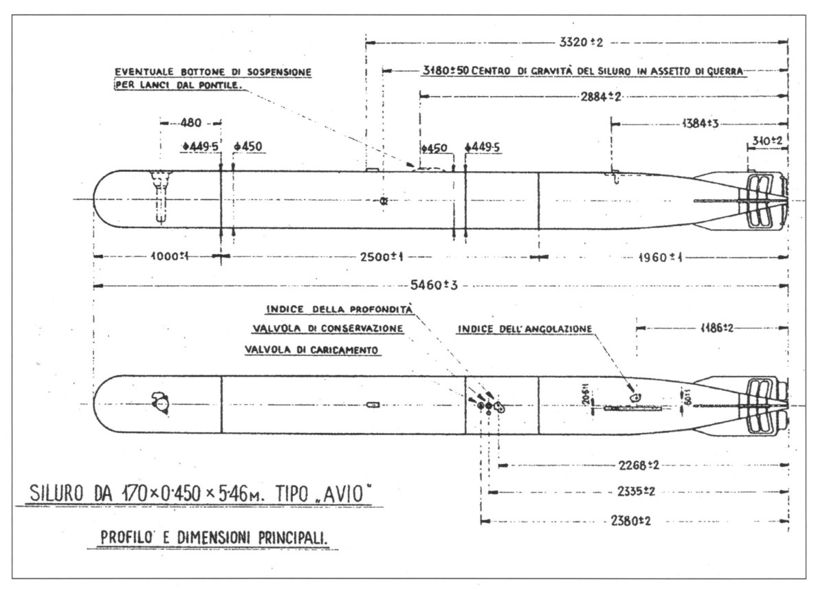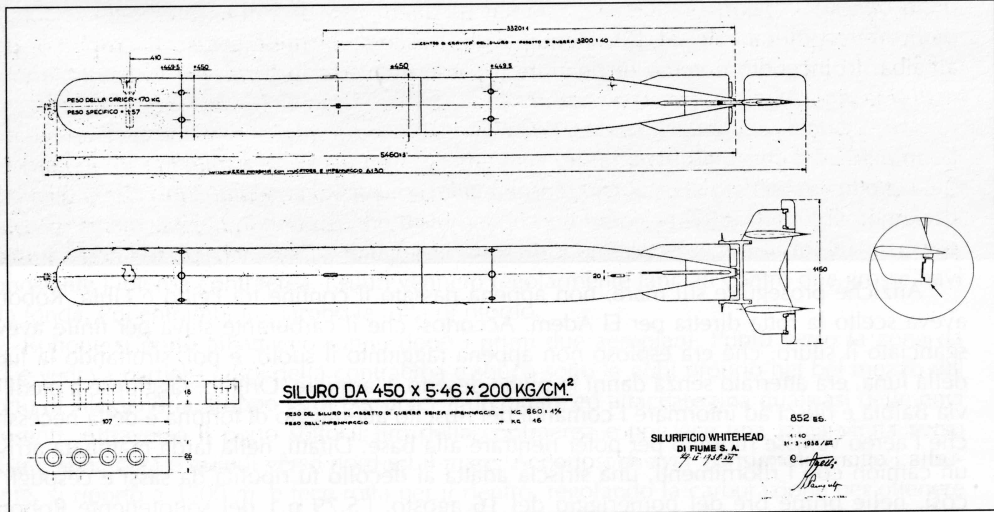It was identified as Siluro 450/170/5.46, the numbers meaning respectively the diameter in millimetres, the warhead weight in kilograms and