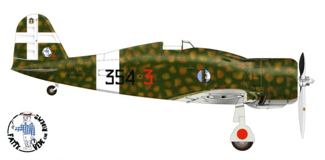built from out-of-the-box. Unit History: 354a, 355a Squadriglie, 21o Gruppo CT, 51o Stormo 356 Sq became Autonomo on 3 June 1940, but rejoined the Gruppo on 4 August. On 13 June CR.32s were detached to Guidonia as a night-fighter section. The Gruppo transferred from 51o to 52o Stormo on 11 September. 354a and 355a Sq became Autonomo and moved to the Greek-Albanian front on 28 October. Three CR.32qtr night-fighters were assigned to 356a Sq on 7 November, to add to its G.50s. December, however, the unit was training on seventeen new MC 200s, as well as a few G.50s. 382a and 386a Sq now joined 356 Sq. In April they moved to Bari for operations in Yugoslav campaign. They may have been on convoy escort duties between Tunisia Sardinia in August. While preparing for anti-partisan operations they received orders to transfer for the Russian front. Between March and July 1942 the unit personnel moved to Stalino, replacing 22o Gruppo as the fighter component of the USSR Expeditionary Force. It received that unit's surviving aircraft in addition to ten new C.200s it had brought with it. In early June 361a Sq arrived from the Aegean. On 27 June two squadriglie were detached to Borvenkovo to cover the crossing of the river Don at Izyum, carrying out fighter sweeps and ground strafing. Using Voroscilovgrad as main base, squadriglie were detached where needed most. Two went to Tazinskaja as esorts to German Ju.87D from 24 July and two then went Obliskaja four days later. In August two were on intercept duties at Millerovo a one was at Kantamirovka until 18 December, when it moved to Starobelsk. It was on 12 December that Tenente Walter Benedetti led seven C.200s of 361a Sq from Kantamirovka to attack Russian troops attempting to surround units of the Italian 8th Army, which were defending the approach to Stalingrad. It seems that the officer was downed by anti-aircraft fire. Reunited back at Voroscilovgrad by the end of December, the last operation was carried out on 17 January 1943 over the Millerovo area. Five days later the unit retired to Stalino, ready for the return journey home. Fifteen unserviceable aircraft were left behind. During September it had received twelve C.202s, and later two photo-recon versions arrived. Bad weather hindered operations and the C.202s only managed 17 sorties with no losses or claims. The C.200s claimed 88 USSR planes for the loss of the fifteen write-offs. In February, at Odessa, the unit had twenty-four C.200s and nine C.202s left. Fully equipping with C.202 Serie VIII machines on returning home, the unti was sent to Sicily after two months in training. 382a Sq left the Gruppo at this time. By August the Gruppo was back in Italy with a few serviceable aircraft left.[2] References [1] Waldis P., M. de Bortoli and A. Brioschi, "Ali e Colori 3, Fiat G.50", La Bancarella Aeronautica, Torino 2000 [2] Dunning, C., "Courage Alone: Italian Airforce 1940-43", Hikoki Publications, 2009