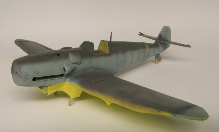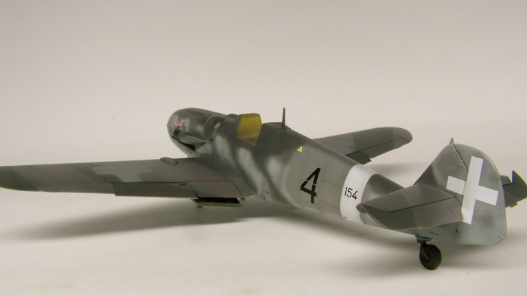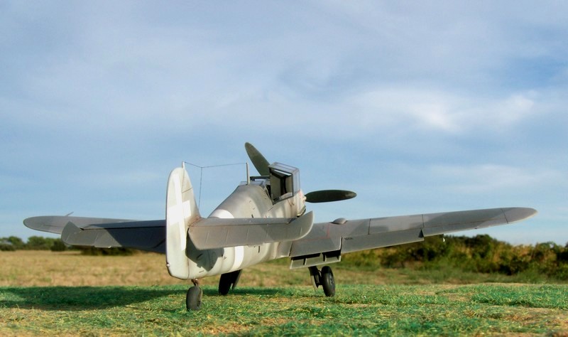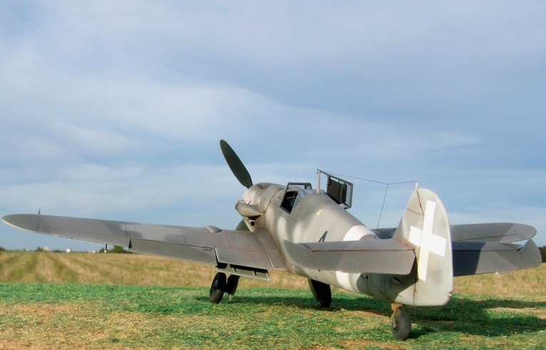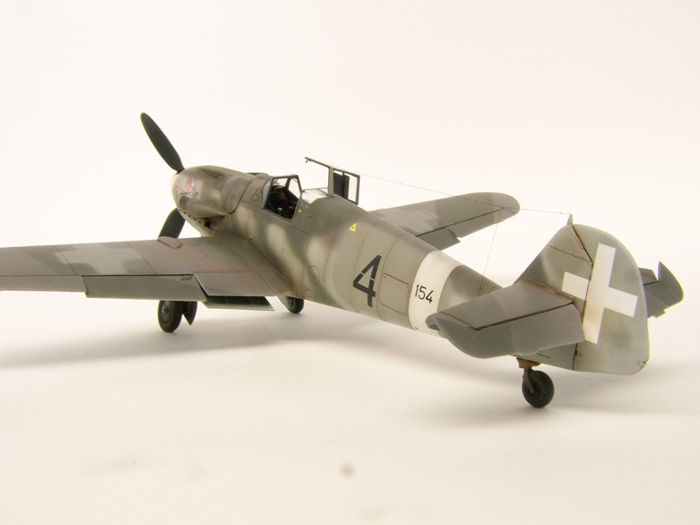 I replaced the instrument panel with photo-etched Eduard. The rest of the cockpit was improved with Eduard etched parts and several cables made from lead wire. The undercarriage and wheel wells are painted in RLM 02. The wheels were painted with Black satin, the tires with Notan Black Tamiya. This aircraft is described as having a camouflage scheme of RLM 75/74 over 76. Wide vague strips on the sides of the fuselage are painted in RLM 74. White theatre markings under the wing tips and the spinner. For the weathering I used a combination of oil wash. Exhaust stains were made by spraying highly thinned black and red paint. This isn't the first Bf.109 Hasegawa I've constructed made, but to dressing in Italian markings is certainly an additional treat. |