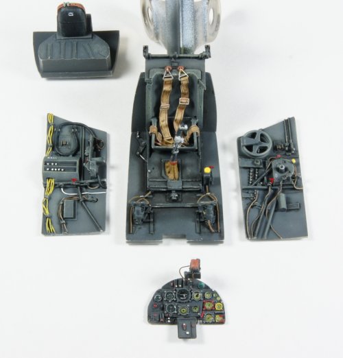 In this build I used the Revell 1/32 Bf.109 K-4. Aftermarket additions included a Bf.109 K-4 cockpit from Eagles Parts, corrected spinner MDC, Air Master Series for the MG-131 and resin exhausts from Ultracast. Construction began with the cockpit, the internal parts of the interior are painted in Tamiya XF-63 Other details were then painted using several shades of acrylic Prince August.