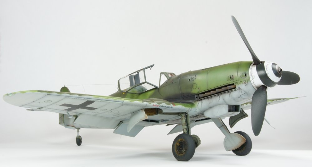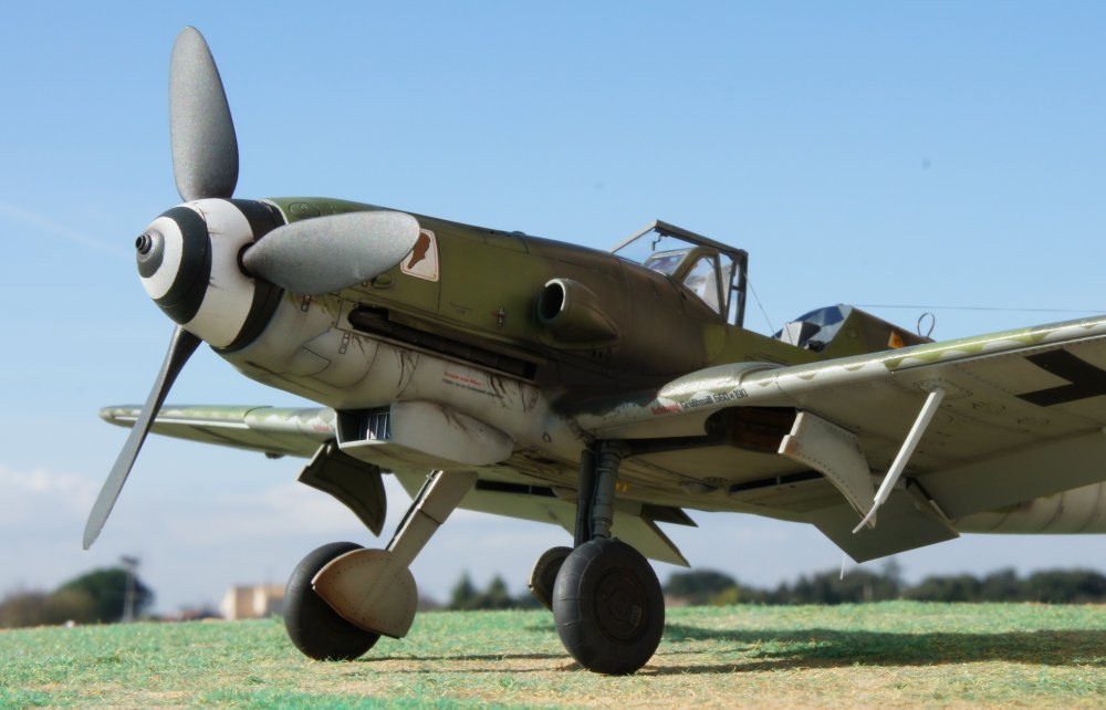 The Landing Gear The brakes hoses are added using fine lead vire. These parts are then painted following the instructions: RLM 02, aluminium for the shock absorber, satin black for the wheels and Nota black for the tires. For the weathering I used Pigments CMK. For the spinner I used the resin part MDC with correct « Teardrop » The propeller and the spinner are painted with RLM 70 (Gunze H65). Markings are from STORMO! Italian Bf.109 Aces Part III - 48003. I chose the plane flown by the Lt Gallori, 3° Squadriglia, I Gruppo Caccia "Asso di Bastoni". The basic color scheme of this BF 109 K-4 was RLM 83/82/76. The rudder painted in RLM 83/82 and the German markings overpainted with grey RLM 75. My model has been painted with Gunze acrylics colors. Note: Lt. Gallori's Bf.109 K4 colors are 75/83/76. References 1) Messerschmitt Bf 109 in Action Part 2, 1057, Squadron/Signal Publications, J. R. Beamna, 1983. 2) Messerschmitt Bf 109, La Bancarella Areonautica, G. Alegi, 2002. 3) Camouflage and Markings of the Aeronautica Nazionale Repubblicana 1943-1945, F. D’Amico and G. Valentini, Classic Publications, 2005.