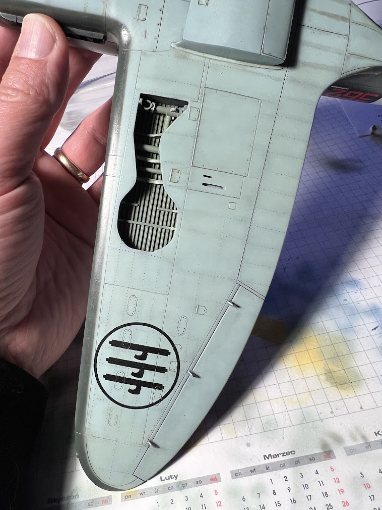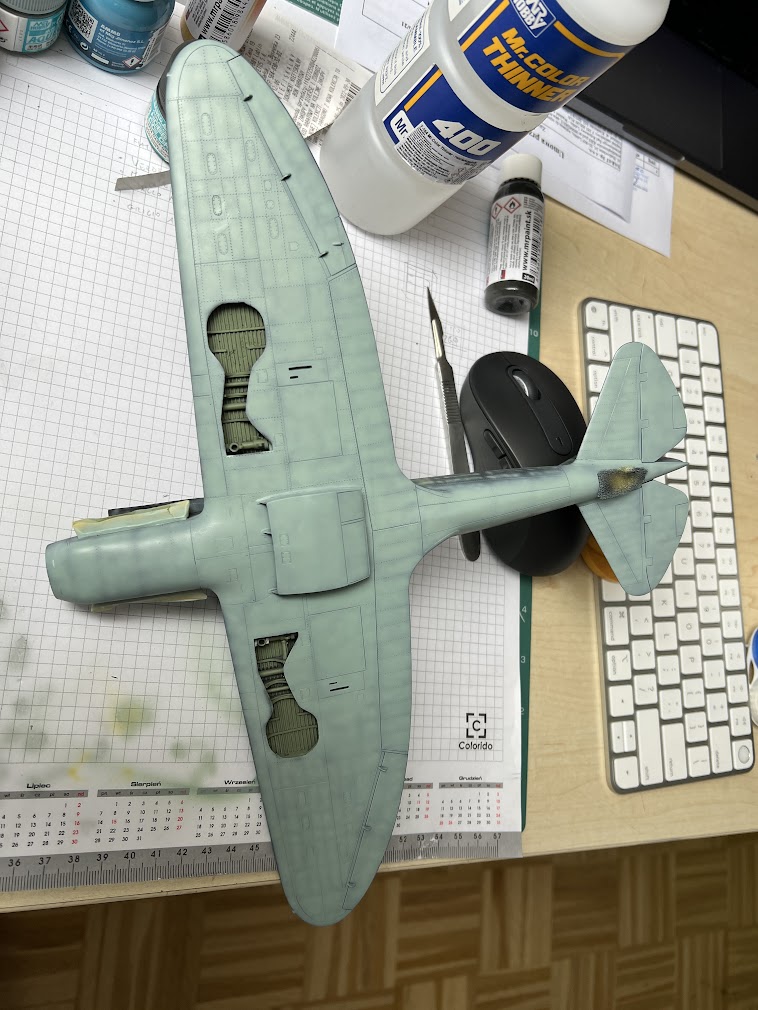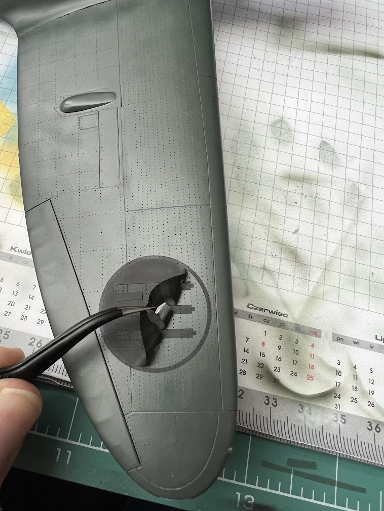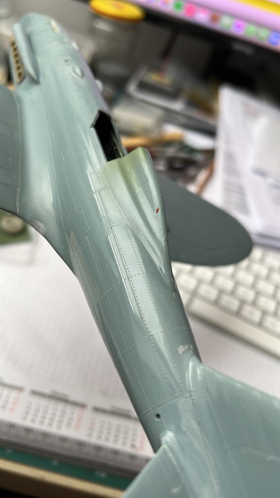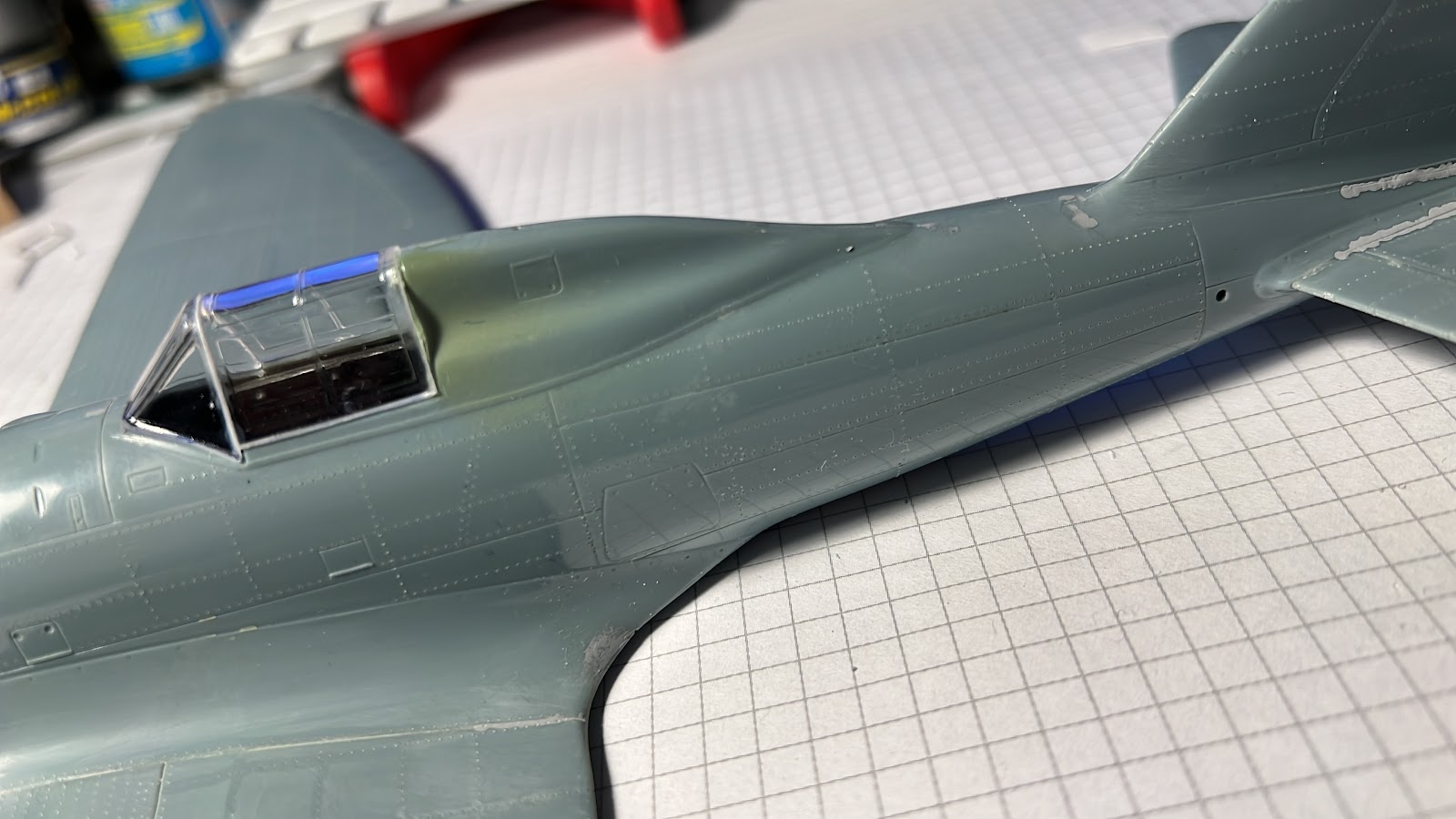 very fine sandpaper and "painted" gently with Tamiya extra thin cement to clean them. Rivets on the fuselage - well... I just left them as they were