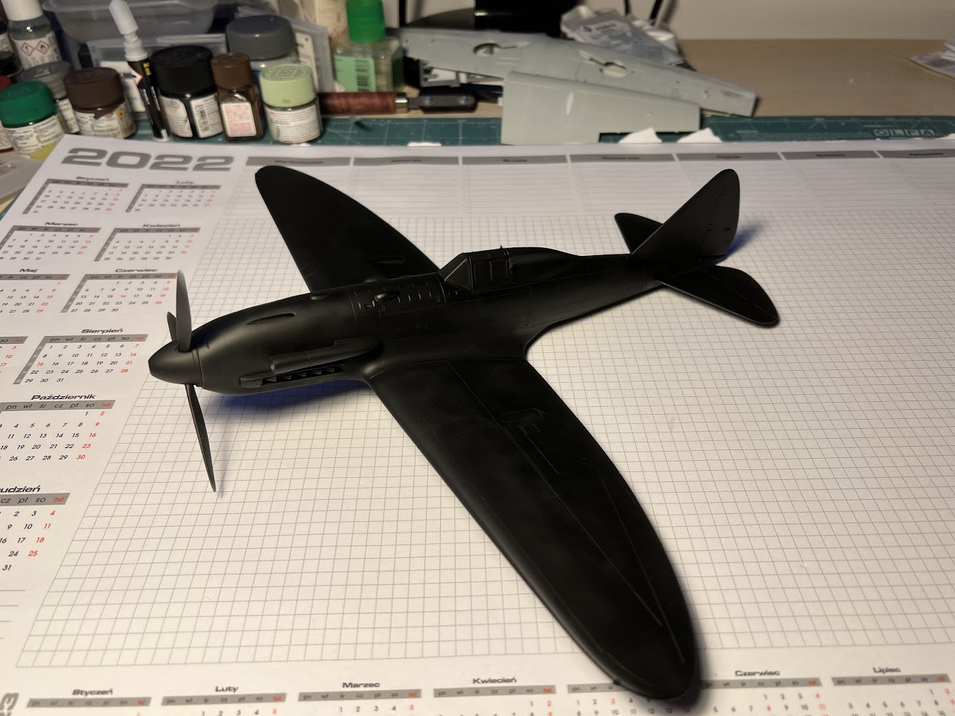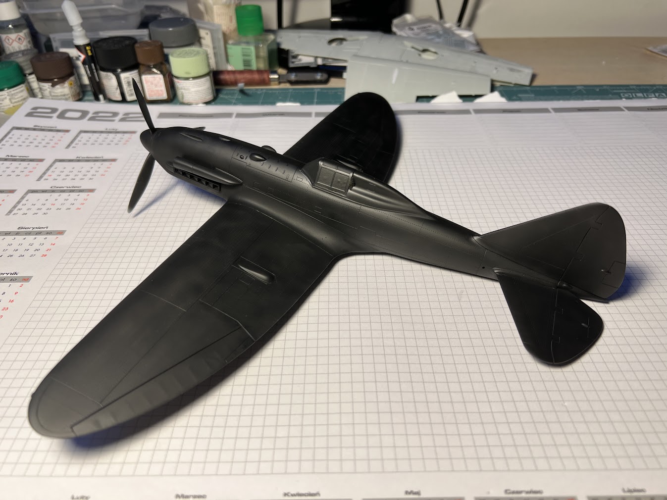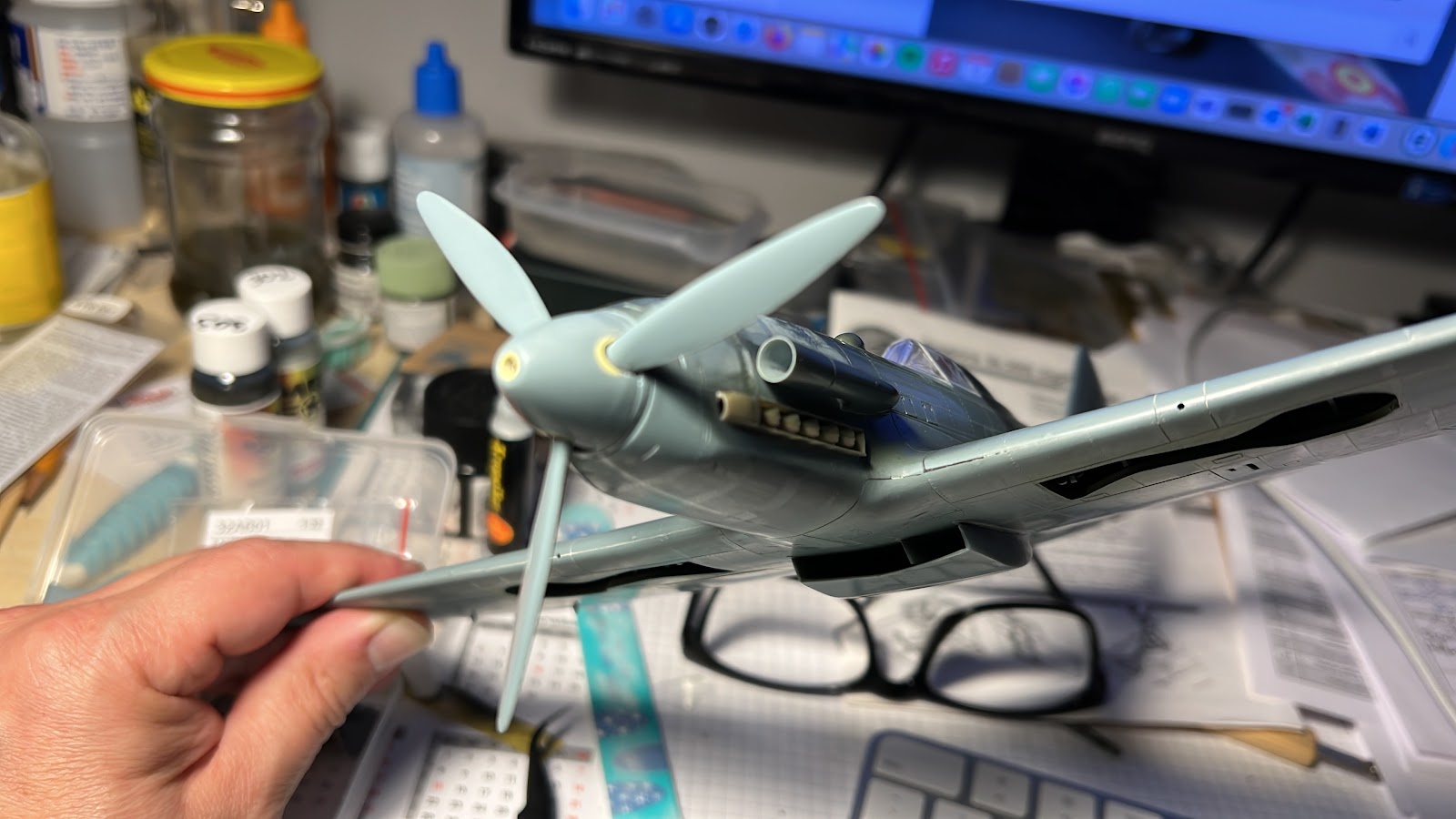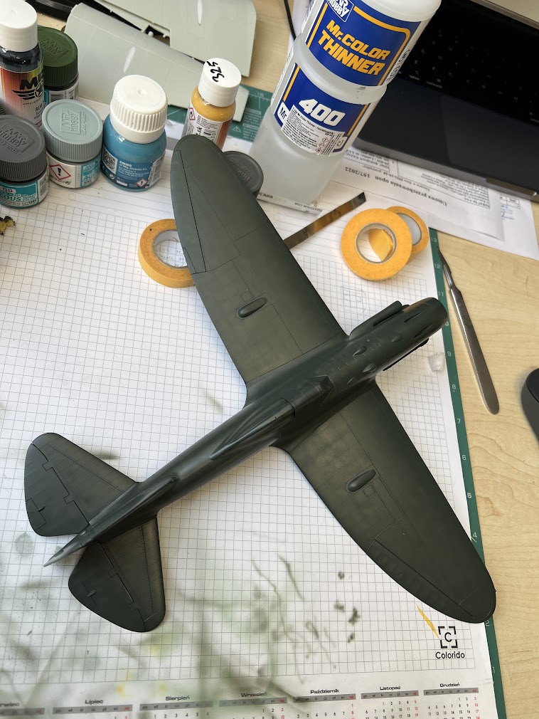 gluing parts together. The wings trailing edges are quite thick and require thinning. The propeller spinner also needed adjustments - the holes